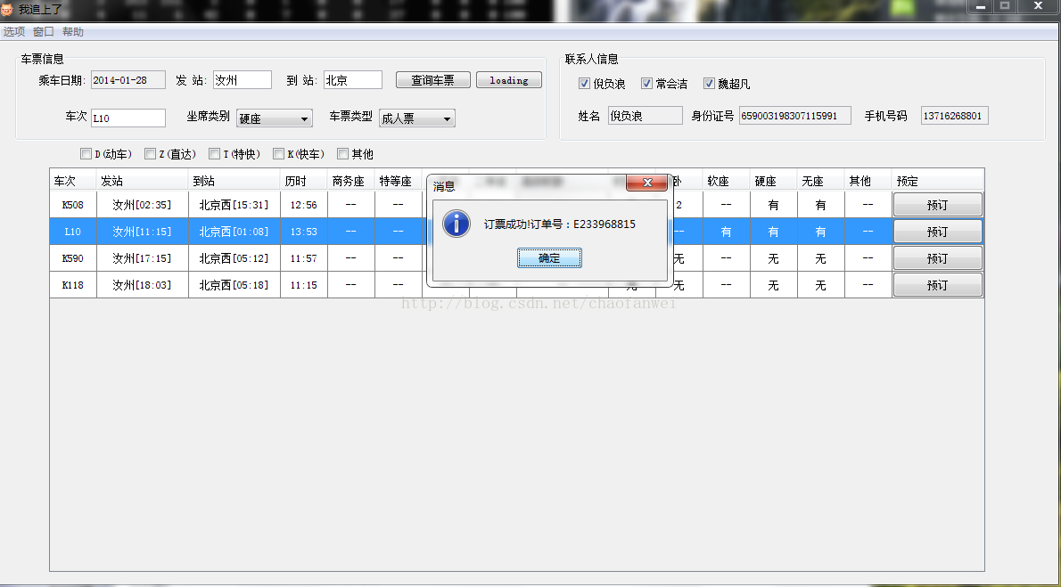 当然需要选择相关的座次,比如硬座,车次L10,点击车次右边的预定,即车次会显示在车次输入框中,然后和相关联系人,复选框选中表示此联系人要购票,看图5。