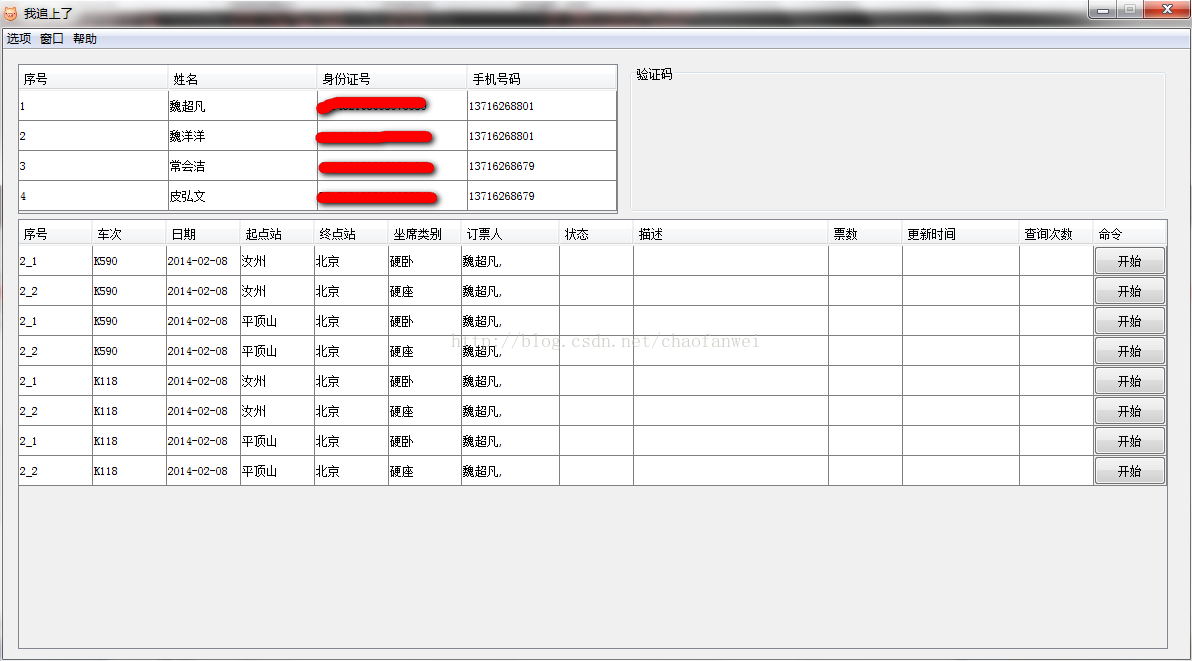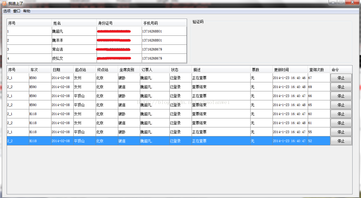 最近考虑到要过年回家买票,想到12306的反应迟钝,卡死、、,我就气愤,于是想着闲着也是闲着,索性再把我毕业答辩时所做的12306抢票软件给更新下,还是用自己的抢票软件来抢票吧,要不还是的站着回去,哎哎,只怪外出打工者太多,火车太少啊。好了,步入正题吧,先看看我最近的成果吧。