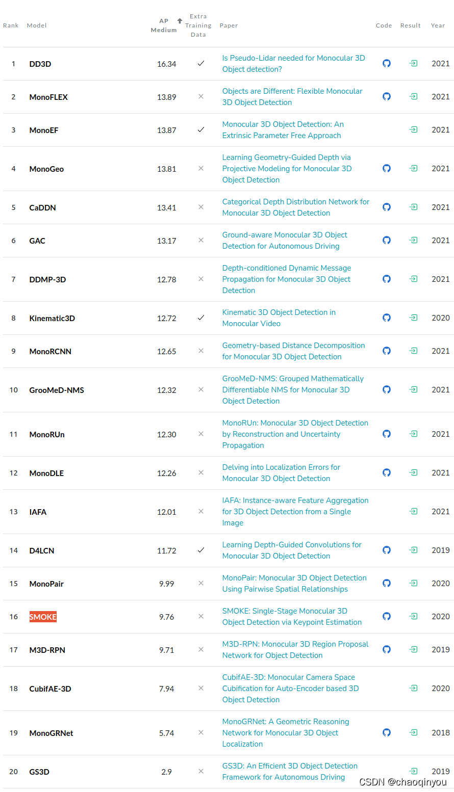 好思路:不直接regression深度,而是regression 3D框高度在图片上的投影,再用相似三角形算出深度; paper:http://openaccess.thecvf.com//content/ICCV2021/papers/Shi_Geometry-Based_Distance_Decomposition_for_Monocular_3D_Object_Detection_ICCV_2021_paper.pdfhttp://openaccess.thecvf.com//content/ICCV2021/papers/Shi_Geometry-Based_Distance_Decomposition_for_Monocular_3D_Object_Detection_ICCV_2021_paper.pdf code:GitHub - Rock-100/MonoDet: MonoRCNN based Monocular 3D Object Detection for Automonous Driving, ICCV 2021 精度对比:KITTI Cars Moderate Benchmark (Monocular 3D Object Detection) | Papers With CodeThe current state-of-the-art on KITTI Cars Moderate is DD3D. See a full comparison of 20 papers with code.https://paperswithcode.com/sota/monocular-3d-object-detection-on-kitti-cars 实现: