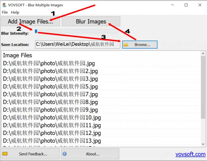 接下来威航软件园简单给大家做了一个Blur Multiple Images使用教程图解,四步即可搞定图片模糊化处理,让大家知道怎样将图片模糊化处理操作,如下图所示: