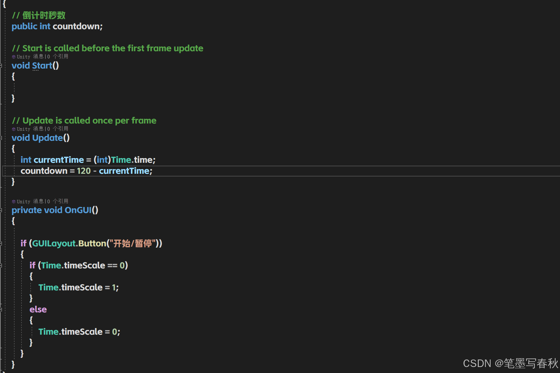 Unity脚本生命周期 Unity脚本生命周期初始化阶段Awake执行时期:当物体创建时执行(1次)OnEnable执行时期:当物体的脚本启用时执行(多次)Start执行时期:当物体的脚本创建启用时执行(1次)物理阶段FixedUpdate执行时期:每隔0.02s执行一次Update执行时期:根据帧率执行,每一帧执行一次LateUpdate执行时期:根据帧率执行,每一帧执行一次,每次都要等Update执行完成之后执行结束阶段OnDisable执行时期:脚本禁用执行OnDestr
