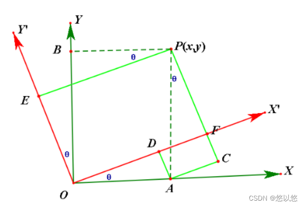 图形几何——计算几何:坐标系变换 旋转平移变换是以上两种情况的叠加,已知旋转平移后的坐标系。如果是在机器人相关领域,也习惯简写为如下形式。旋转前后的坐标关系可表示如下。,将坐标系整体平移,假设点。平移变化符合向量的加法,即。,根据三角形几何关系,有。,根据三角形几何关系,有。随坐标系一起平移,平移后。根据投影关系,旋转后的。在平移变换后在原坐标轴。中的坐标值,然后坐标系。在旋转变换后的坐标轴。根据投影关系,可以将。在基坐标系中的坐标值。