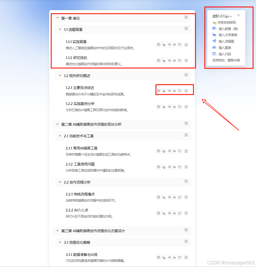 实测"AI插画流程优化"这个题目,它生成的大纲直接细化到三级目录。最牛的是,每个章节都能自己删改,还能加流程图、数据表这些刚需配件。