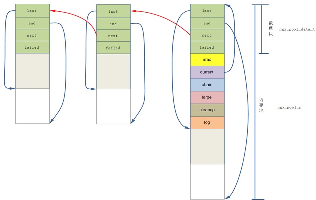 由ngx_pool_data_t和ngx_pool_t组成的nginx内存池结构如下图所示:
