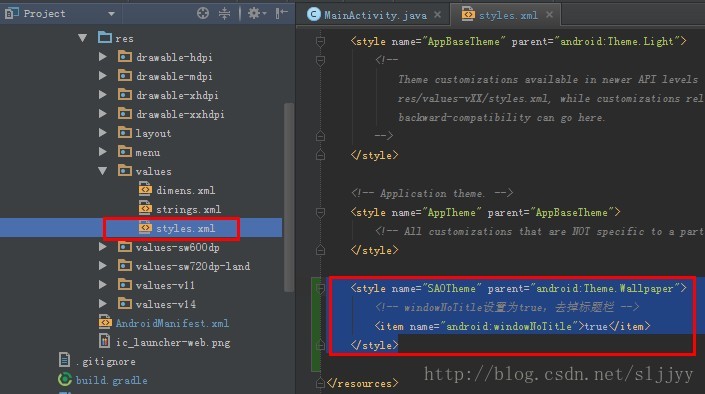 在res/valuse下面增加一个xml文件,其名称为styles.xml(AndroidStudio新建的项目会自动创建styles.xml我们只需要在resources标记对下添加),内容如下: