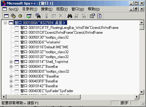 打开spy ++,会以树状图显示当前系统所有的窗体信息,如下所示
