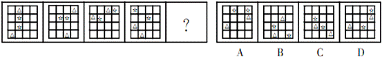 分别来看,所有的三角形都分布在表格的边界上,所有的星星都在方格的对角线上,这样就找到了图形组成元素在位置分布上的规律,结合选项,符合这个规律的只有D项。