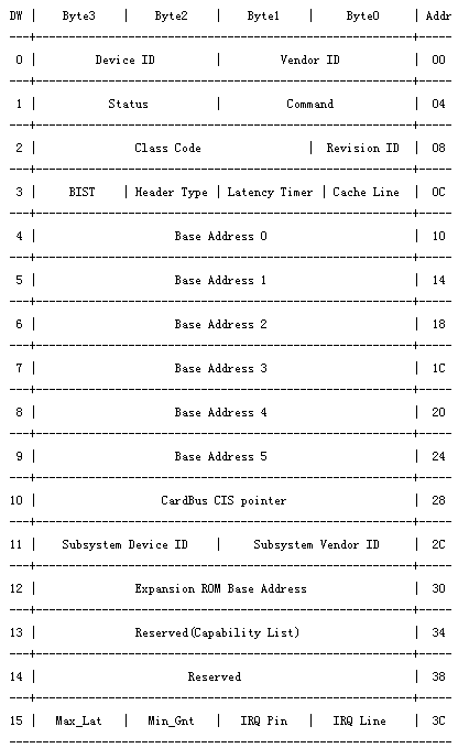 - PCI总线规范定义的配置空间总长度为256个字节,配置信息按一定的顺序和大小依次存放。前64个字节的配置空间称为配置头,对于所有的设备都一样,配置头的主要功能是用来识别设备、定义主机访问PCI卡的方式(I/O访问或者存储器访问,还有中断信息)。其余的192个字节称为本地配置空间(设备有关区),主要定义卡上局部总线的特性、本地空间基地址及范围等。