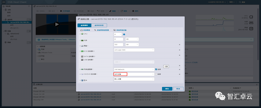 18、回到虚拟机界面,点击“操作”——“编辑设置”将CD/DVD驱动器改为“主机设备”,点击保存。