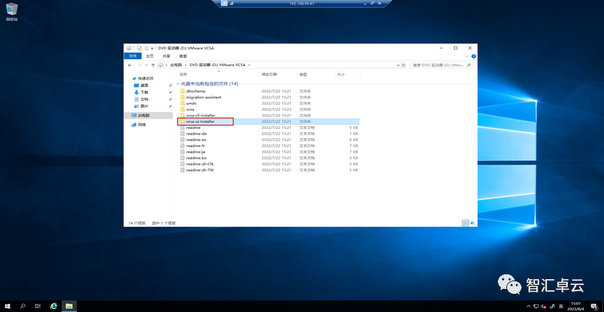 4、打开域控制器虚拟机,打开文件资源管理器,双击打开“DVD驱动器(D:) VMwareVCSA”。