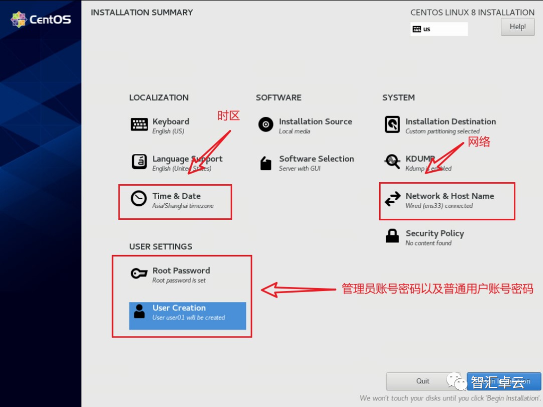 5.配置网络、时区以及设置账号密码(过程略),配置完成后进行安装