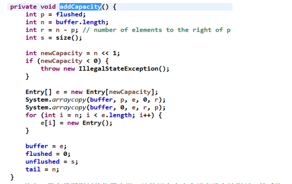 指针重绕后,需要对尾部指针 tail 和需要刷新的位置 flushed 进行判断, 如果两者相等,说明指针重绕后已经到达需要刷新的位置,再继续使用就会覆盖 尚未发送的消息,因此,需要对环形队列进行动态扩容,动态扩展的代码如下: