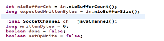 在批量发送缓冲区的消息之前,先对一系列的局部变量进行赋值, 首 先, 获 取 需 要 发 送 的 ByteBuffer 数 组 个 数 nioBufferCnt, 然 后, 从 ChannelOutboundBuffer 中获取需要发送的总字节数,从 NioSocketChannel 中 获取 NIO 的 SocketChannel, 是否发送完成标识设置为 false,是否有写半包标 致设置为 false。