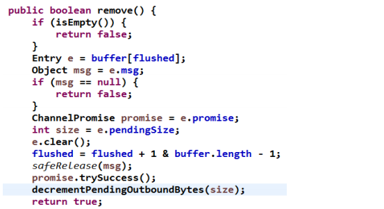 首 先 判 断 环 形 队 列 中 是 否 还 有 需 要 发 送 的 消 息, 如 果 没 有, 则 直 接 返 回。 如 果 非 空, 则 首 先 获 取 Entry, 然 后 对 其 进 行 资 源 释 放, 同 时 把 需 要 发 送 的 索 引 flushed 进 行 更 新。 所 有 操 作 执 行 完 之 后, 调 用 decrementPendingOutboundBytes 减 去 已 经 发 送 的 字 节 数, 该 方 法 跟 incrementPendingOutboundBytes 类似,会进行发送低水位的判断和事件通知, 此处不再赘述。