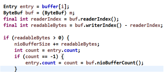 下面我们看另一个分支,如果 ByteBuf 包含 NIO ByteBuffer 数组,那就获 取 Entry 缓存的 ByteBuffer 数组,如果为空,则从当前需要刷新的 ByteBuf 中获取它的 ByteBuffer 数组。完成赋值操作后,调用 fillBufferArray 进行赋值。 对循环变量 i 赋值,完成本轮循环,代码如下: