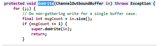首先计算需要发送的消息个数(unflushed - flush), 如果只有 1 个消 息需要发送,则调用父类的写操作,我们分析 AbstractNioByteChannel 的 doWrite() 方法,代码如下: