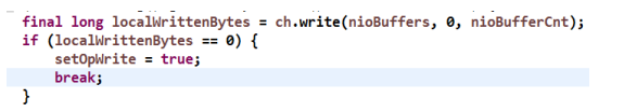 下面对写入的字节进行判断,如果为 0,说明 TCP 发送缓冲区已满,再写很 有可能还是写不进去,因此从循环中跳出,同时将写半包标识设置为 True, 用于 向多路复用器注册写操作位,告诉多路复用器有没发完的半包消息,你要继续轮 询出就绪的 SocketChannel 继续发送: