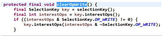 最后,因为缓冲区中待刷新的消息没有全部发送完成,所以需要更新 SocketChannel 的注册监听位,将其修改为 OP_WRITE, 在下一次轮询中继续发送 没有发送出去的消息。