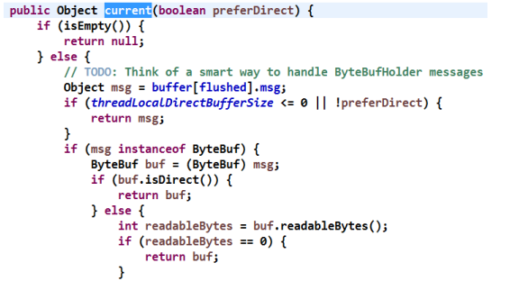 声明各种局部变量并赋值,从 flushed 开始循环获取需要发送的 ByteBuf。 首先对要发送的 Message 进行判断,如果不是 Netty 的 ByteBuf,则返回空。
