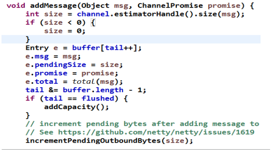 首先对链路的状态进行判断,如果已经断开连接,则需要设置回调结果异 常信息,同时,释放需要发送的消息。注意:此处的消息通常是经过编码后的 ByteBuf,因此,需要释放。 如果链路正常,则将需要发送的 ByteBuf 加入到 outboundBuffer 中,下面, 我们重点分析 ChannelOutboundBuffer 的 addMessage 方法。代码如下: