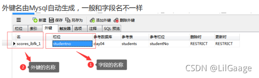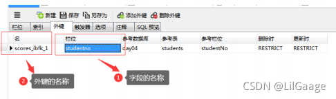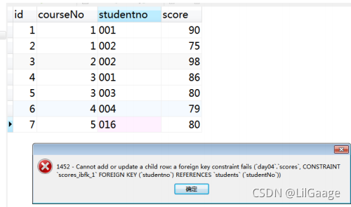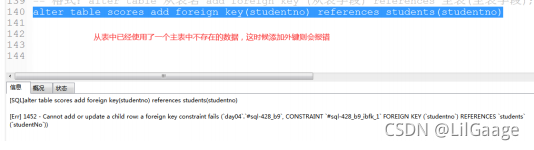 ①设置外键后,从表中添加数据时,所添加的数据必须在主表中存在,否则报错