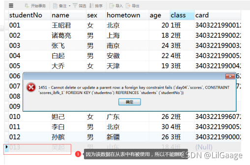② 设置外键后,主表中删除数据时,必须保证该数据在从表中没有被使用,否则报错