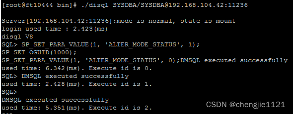 | ./disql SYSDBA/SYSDBA@192.168.104.42:11236 SP_SET_PARA_VALUE(1, 'ALTER_MODE_STATUS', 1); SP_SET_OGUID(1000); SP_SET_PARA_VALUE(1, 'ALTER_MODE_STATUS', 0); ALTER DATABASE STANDBY;
