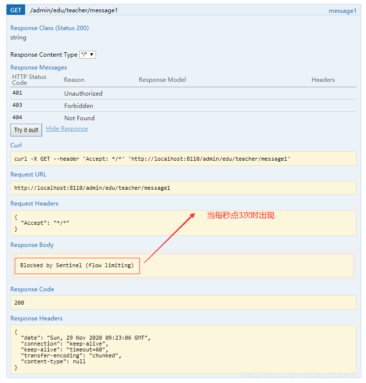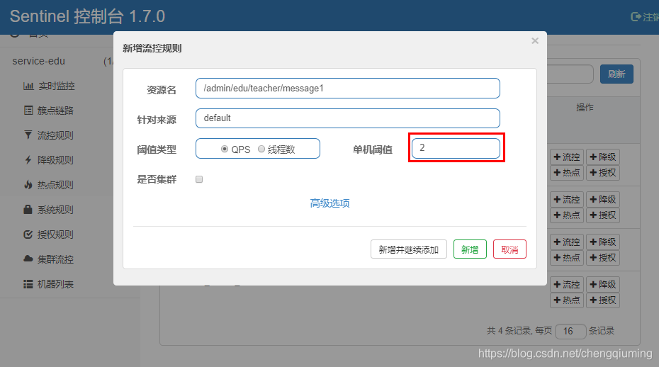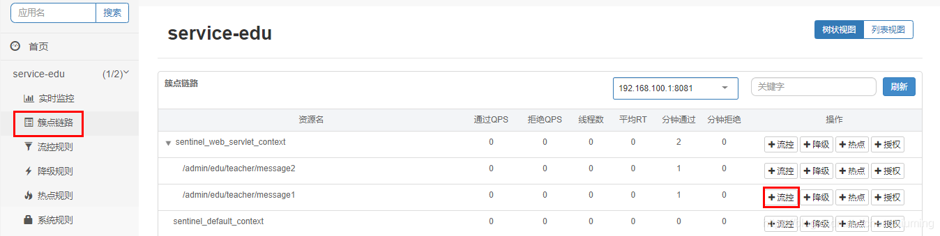 案例中就是为message1资源设置了一种流控规则, 限制了进入message1的流量