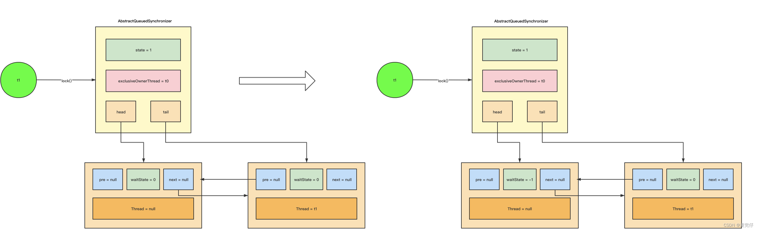 情景二:若此时t1获取锁失败,则AQS和Node的变化示意图如下: