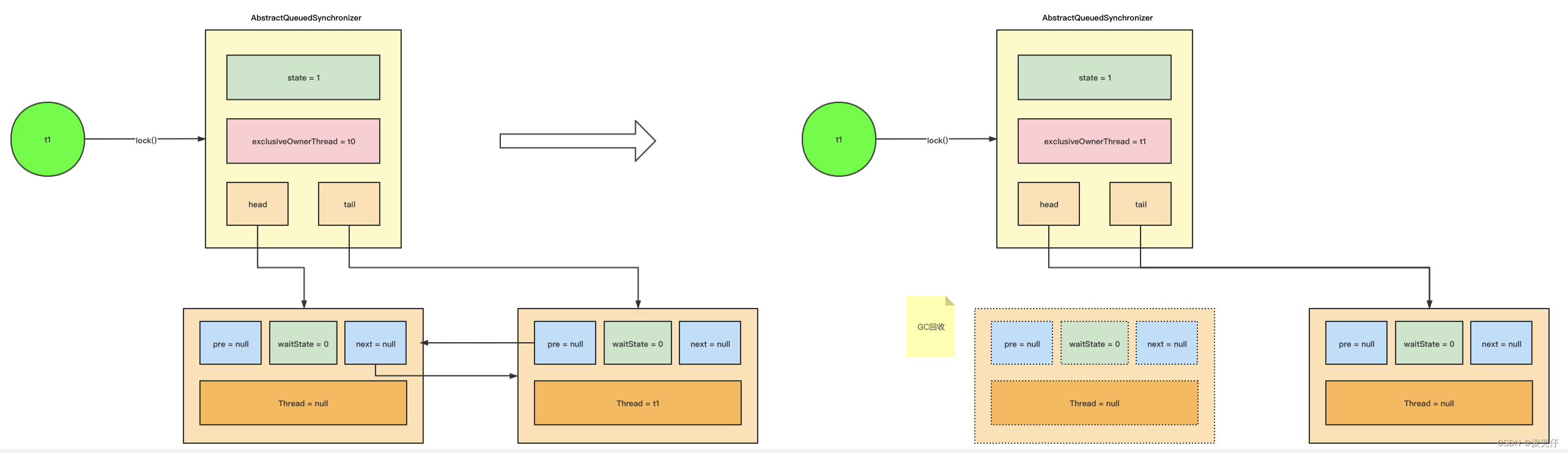 此时会将AQS的exclusiveOwnerThread修改为t1,将t的前驱结点出队,将t的thread置为null,并将AQS的head和tail都指向t(此时t相当于又变成了初始化的Node对象)