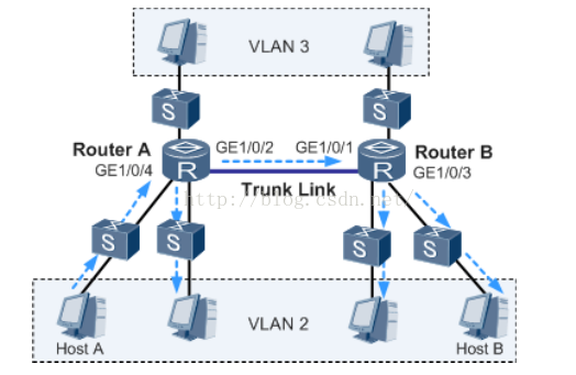 (3) 如果从Trunk端口发送的帧带Tag,但是与端口缺省的VLAN ID不同,则交