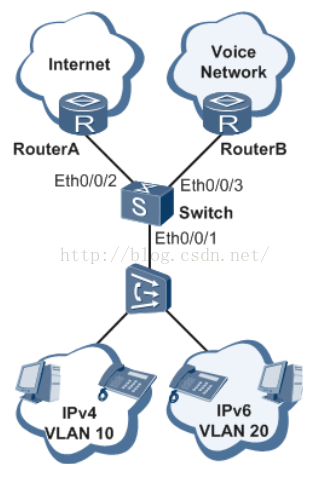 如图所示,Switch收到的用户报文有多种业务,所采用的协议各不相同。VLAN10中的用户采用IPv4协议与远端用户通信,而VLAN20中的用户采用IPv6协议与远端服务器通信。现需要将不同类型的业务划分到不同的VLAN中,通过不同的VLAN ID分流到不同的远端服务器上以实现业务互通。