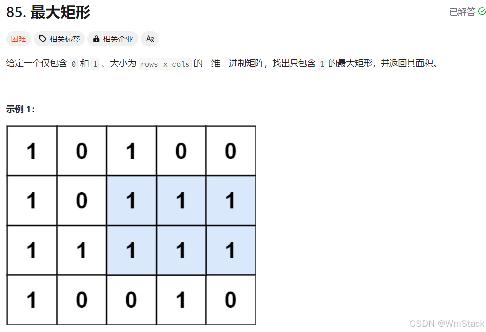public static int maxN=201; public static int[]Stack=new int[maxN]; public static int r; public static int[] height=new int[maxN]; public int maximalRectangle(char[][] matrix) { //状态压缩矩阵! int n=matrix.length; int m=matrix[0].length; int ans=0; Arrays.fill(height,0); for (int i=0;i<n;i++){ for (int j=0;j<m;j++) { height[j] = matrix[i][j] == '0' ? 0 : height[j] + 1; } ans=Math.max(ans,largestRectangleArea(m)); } return ans; } public int largestRectangleArea(int m){ int ans=0; for (int i=0;i<m;i++){ while (r>0&&height[i]<=height[Stack[r-1]]){ int cur=Stack[--r]; int left=r>0?Stack[r-1] :-1; ans=Math.max(ans,(i-left-1)*height[cur]); } Stack[r++]=i; } //清算阶段 while (r>0){ int cur=Stack[--r]; int left=r>0?Stack[r-1] :-1 ; ans=Math.max(ans,(m-left-1)*height[cur]); } return ans; }