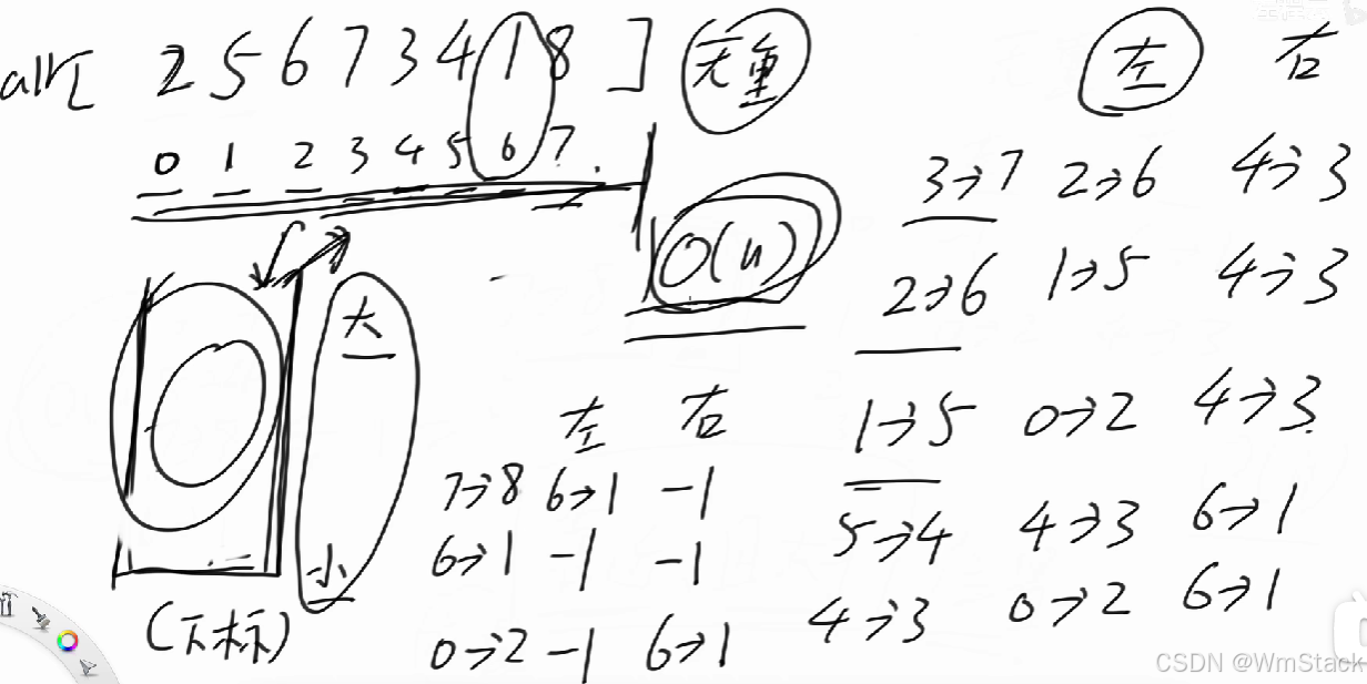 操作:准备一个栈,用该栈要求从栈顶到栈底 必须遵循从大到小,,接着遍历数组,如果栈空或者栈顶数比当前数小,则直接进栈;如果栈顶数比当前数大,则将栈顶数出栈 ,记录栈顶数左右两边最近且比他小的数:左边比它小的数,就是在栈中被他压着的数,也就是出栈后的,下一个栈顶;右边比它小的数,就是当前数组中遍历到的数