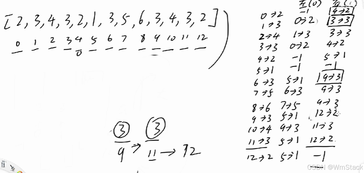 eq1 //给定一个整数数组temperatures,表示每天的温度,返回一个数组answer,其中answer[i] // 是指对于第 i 天,下一个更高温度出现在几天后。如果气温在这之后都不会升高,请在该位置用0 来代替 //也就是求每个下标 右边的 且严格大于的 下标差值,那么栈结构就要依照从小到大 public static int maxN=100001; public static int[] stack=new int[maxN]; public static int r; public int[] dailyTemperatures(int[] temperatures) { int n= temperatures.length; int[] answer = new int[n]; r=0; for (int i=0;i< temperatures.length;i++){ while (r>0 && temperatures[i]>temperatures[stack[r-1]]){ //stack[r-1]就是查看栈顶的值但是不对栈进行操作 int cur=stack[--r]; answer[cur]=i-cur; } stack[r++]=i; } //当只需要求一侧离自己最近的大于或者小于的值的时候,就不用进行校验阶段。 //清算阶段时右边的数字是全为-1,的右边的数字来自数组的遍历,左边的数来自栈内 return answer; }