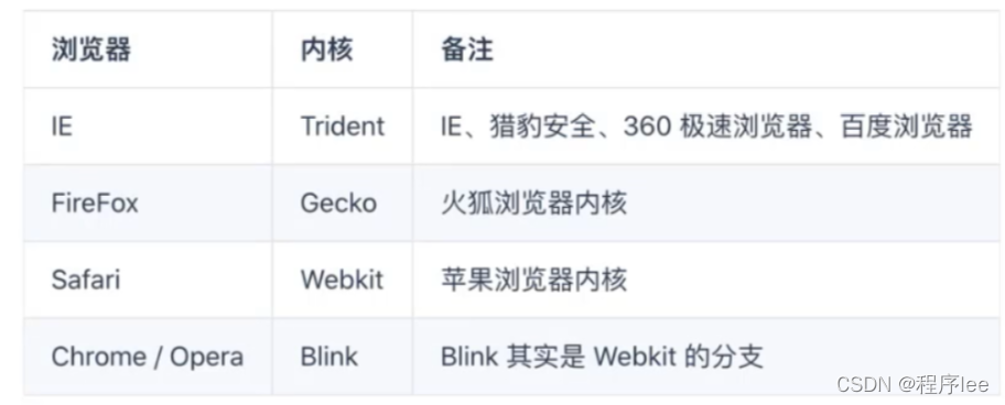 除此之外每个浏览器都有自己的内核,渲染引擎(浏览器内核)︰浏览器中专门对代码进行解析渲染的部分浏览器出品的公司不同,内在的渲染引擎也是不同的: