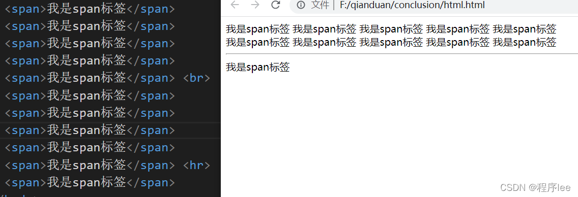 如图所示,span标签为行内元素,因此排列是紧挨着不会换行,使用了<br>后进行了换行,使用了<hr>画出一条水平线并换行。