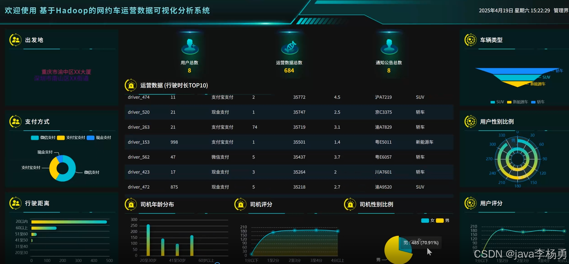 实践与应用意义: 本系统具有极高的实际应用价值。对于网约车平台运营方而言,系统能够将原始数据转化为直观的、可操作的商业洞察。