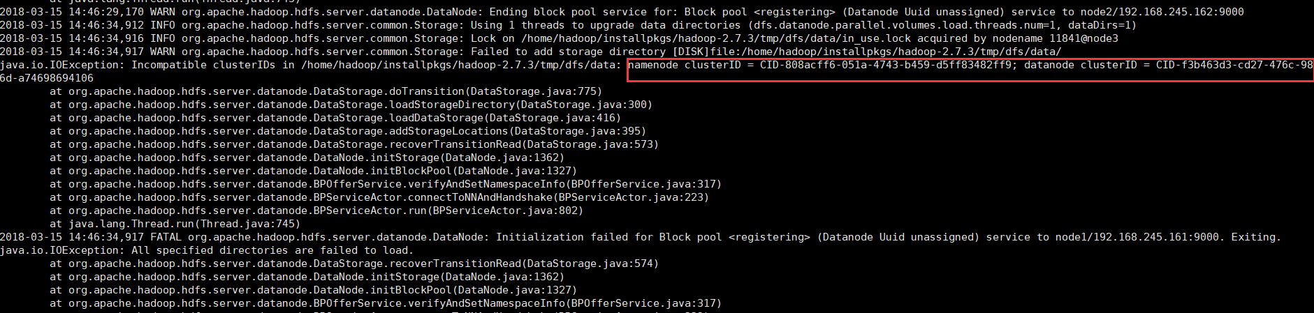今天笔者在集群启动的时候发现datanode没有启动,立马查看了datanode日志,发现了如下问题: