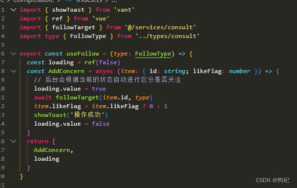 vue3的逻辑复用 在项目开发中,有两个功能特别类似,如果单独实现,会有很多重复的代码在v3中,我们利用组合式api的特点,他们抽象出来,进行封装,把得到函数写在一个单独的模块中,导出,以供复用例如:在做xxx项目,有一个“关注”功能,他们调用的api接口是同一个,就是一个参数不同,但是我们有额外的loading功能也集成在里面针对这种情况,我封装了一个自定义的 hook函数,在函数的内部封装请求和loading值的修改,返回这个loading值和调用api函数代码如下:页面复用。