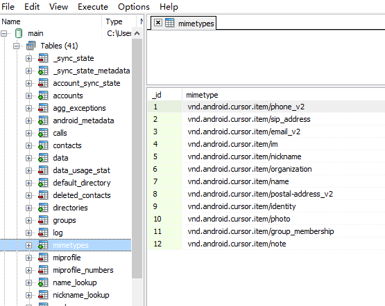 这里包括了很多表,而我们只看几个比较重要的表,contacts,data,mimetypes,raw_contacts。