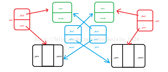 } 其实也并没有做太大的修改,只是将其中的_pre和_next的类型换成weak_ptr,当这个测试用例运行到sp2->_pre=sp1结束后,节点之间的相互关系与上图基本无差别,但是这里有一点发生了变化,就是由于每个节点仅有一个shared_ptr的对象管理,这里两块引用计数空间中的use均为1,而由于多了weak_ptr的对象_pre或_next指向,这里weak的值就变成了2,因此根据前面的讨论,两个节点空间就成功释放了: