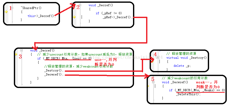 在对sp2所管理的节点释放之后,就完成了之前第4步的调用,接下来进行第5步调用_Decwref(),尝试释放sp2所对应的引用计数空间,但由于这里weak等于2,- -weak之后,weak=1,所以并不能释放对应引用计数空间,到这里为止,就完成对sp2对象的释放;