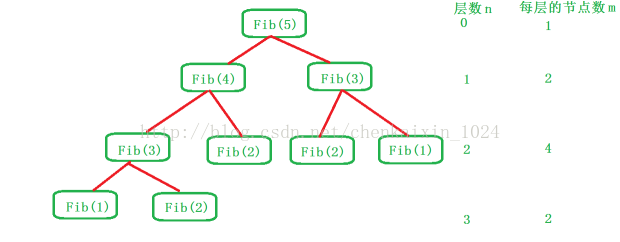 当我们需要求Fib(5)的时候,则必须要先知道Fib(3)和Fib(4),要知道Fib(4)则要知道Fib(3)和Fib(2),总之我们这个算法的核心就是通过Fib(n-1)与Fib(n-2)来求出Fib(n),由此往下直至已知的Fib(1)和Fib(2),由此我们就得到了上图的树结构,其中的每一个节点都是一次递归调用,而我们知道当n趋近无穷大的时候,最后一层的那两个节点是可以忽略的,所以我们可以根据层数与节点数之间的关系m=2^(n)以及层数与所给的参数N之间的关系N=n+3(忽略最后一层),求出总节点数(即递归调用总次数)M=2^(N-3) -1,而递归深度也就是我们的层数n=N-2。