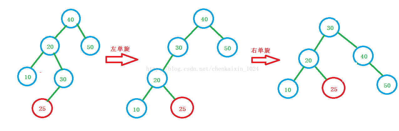 由于对在较高的左子树的右侧插入节点(25),无法通过简单的左单旋或者是右单旋来直接旋转得到符合AVL树性质的子树,因此我们在这里先进行左单旋得到一个类似于前面提到过的可进行右单旋的子树,再进行右单旋得到我们想要的符合AVL性质的子树。