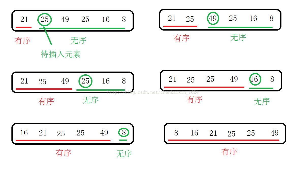 基本思想:取序列中的第i个元素,(在取到第i个元素之前,第i个元素前面的序列已经经过排序,成为有序序列,第i个元素及其之后的序列即为无序序列),将第i个元素与之前的有序序列中的元素依次进行比较,并将其插入到合适的位置,由此对原序列中的每一个元素进行上述操作,即可得到有序序列