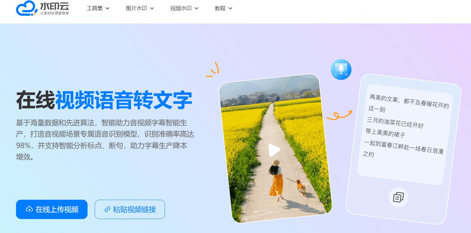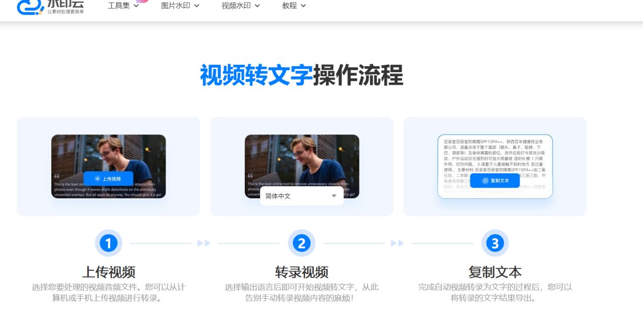 水印云作为一个综合性的在线音视频处理平台,以其快速、便捷的视频转文字功能而受到用户的青睐。它不仅能将视频内容转换为文字,还整合了多项实用的音视频工具,为用户提供一站式的解决方案,尤其适合需要进行批量处理或多重操作的用户。