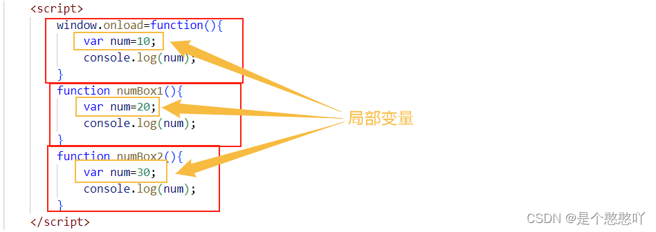 红色框起来的是函数,黄色框起来的是变量。局部变量只有在函数里面才可以使用,如果在函数外面是使用不了的;