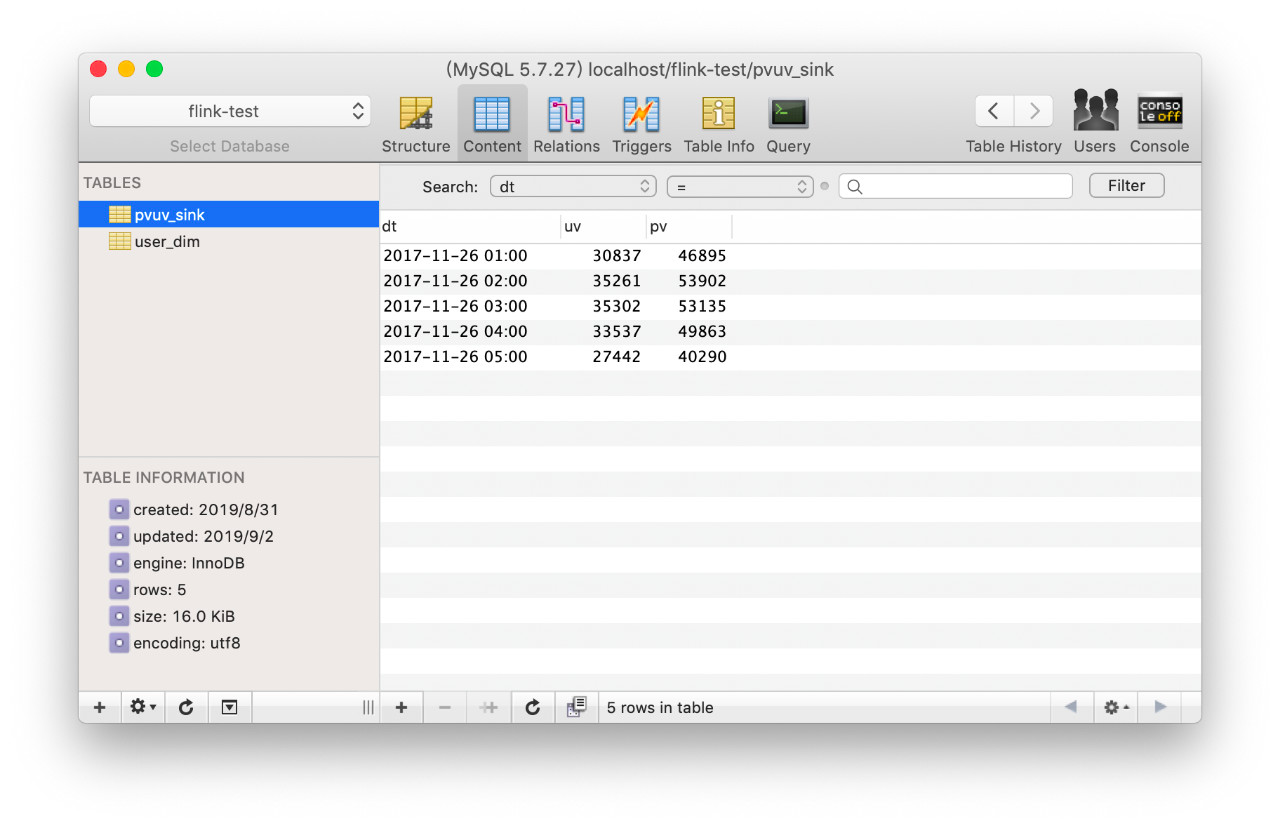 我们将这个查询的结果,通过 INSERT INTO 语句,写到了之前定义的 pvuv_sink MySQL 表中。