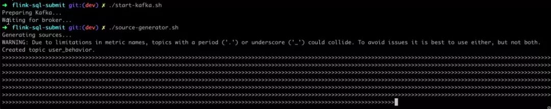 1.在 flink-sql-submit 目录下运行 ./source-generator.sh,会自动创建 user_behavior topic,并实时往里灌入数据。